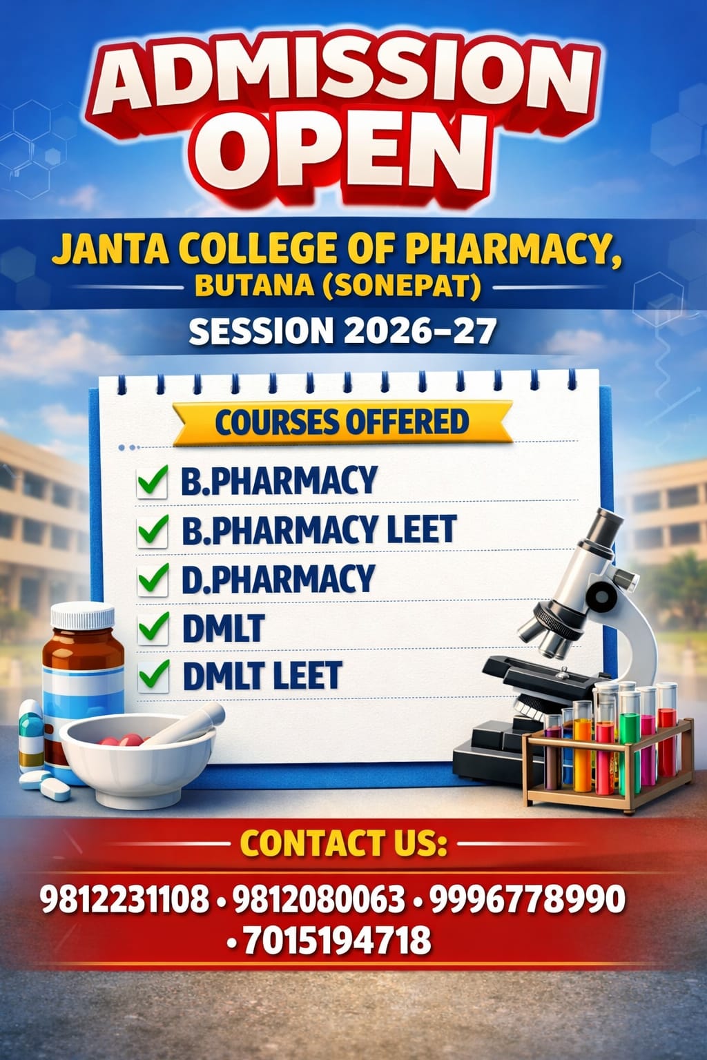 Janta College of Pharmacy Butana, Sonepat Haryana runs course(s) in Pharmacy stream(s).
